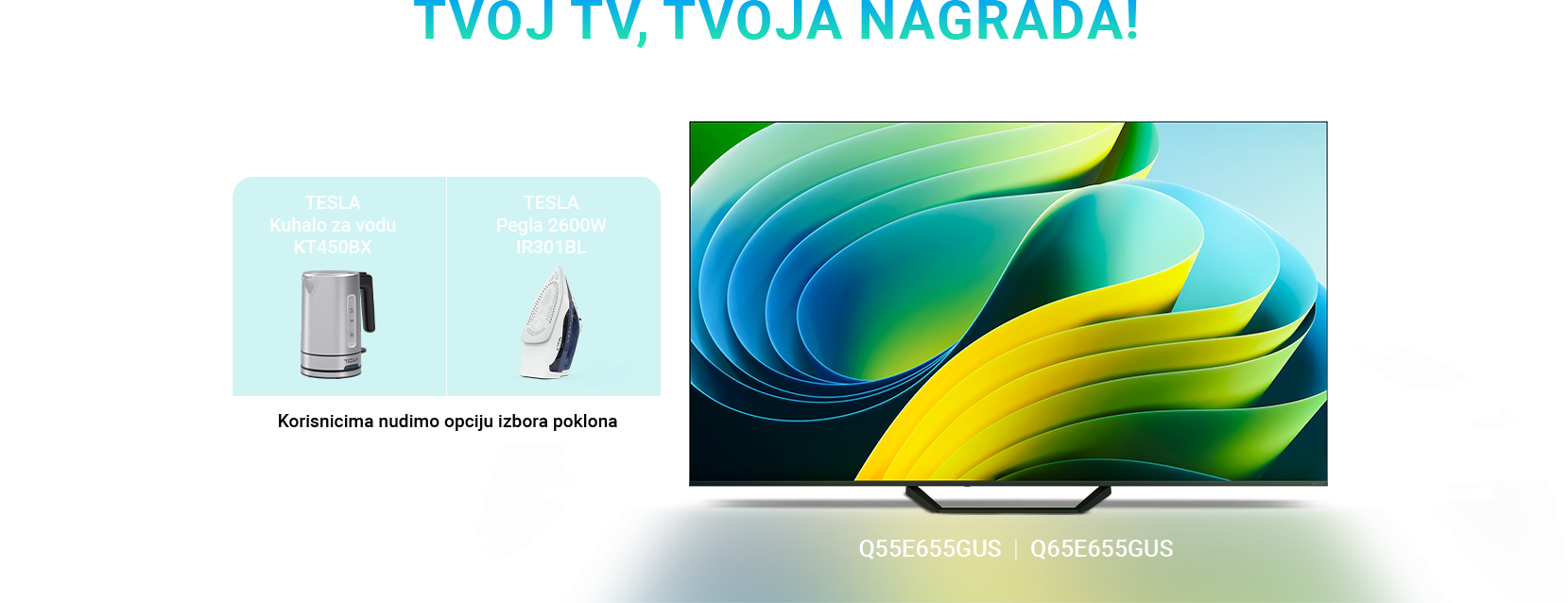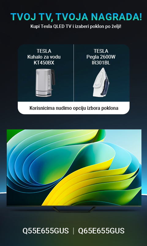 Pravo na poklon ostvaruje se uz kupovinu odabranih Tesla televizora Q55E655GUS ili Q65E655GUS u periodu od 01.03. do 31.03.2026. godine.